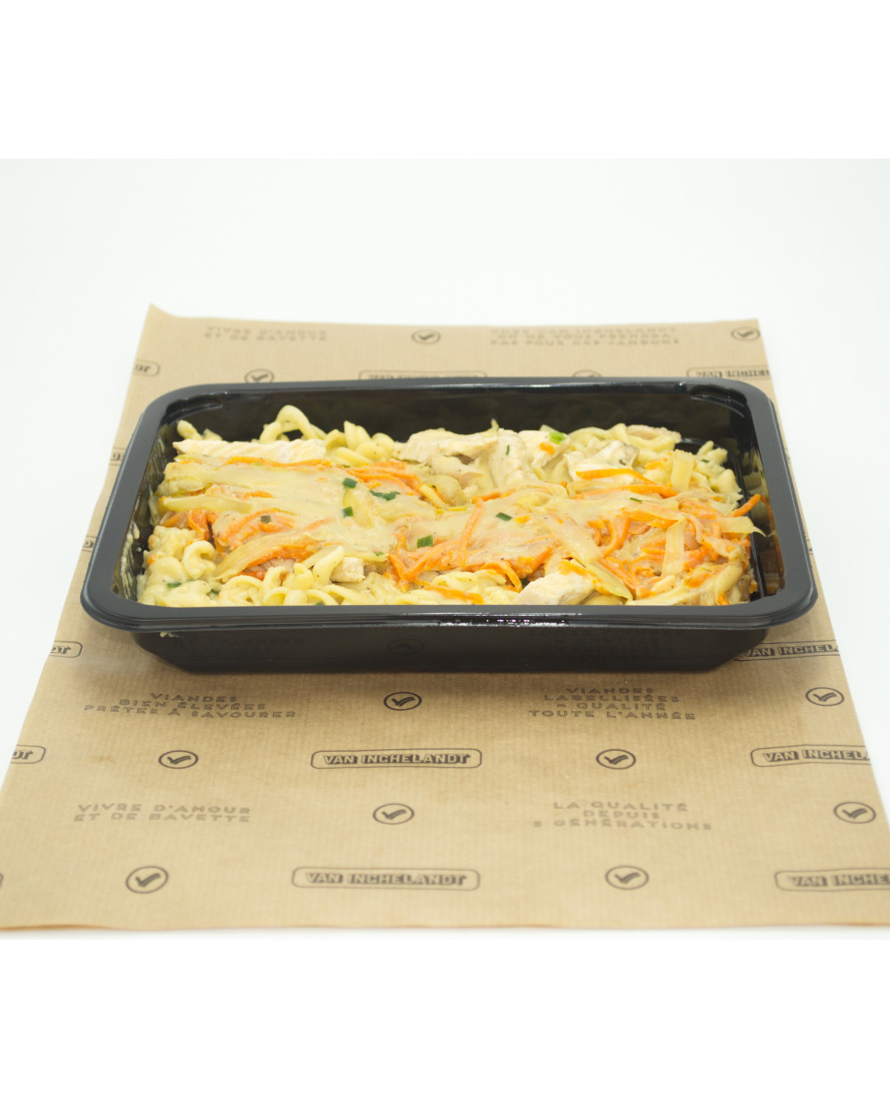 Ingrédients : Blanc de dinde, pâtes, carottes, poireaux, échalotes, persil, vin blanc, bouillon de poule aromatisé aux légumes, crème liquide, beurre, farine, sel et poivre.
