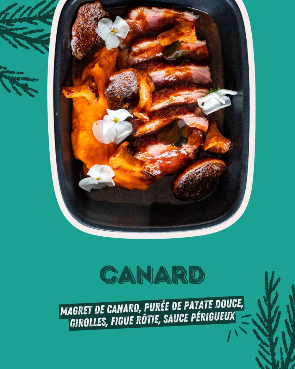 Magret de canard, purée de patate douce, girolles, figue rôtie, sauce périgueux