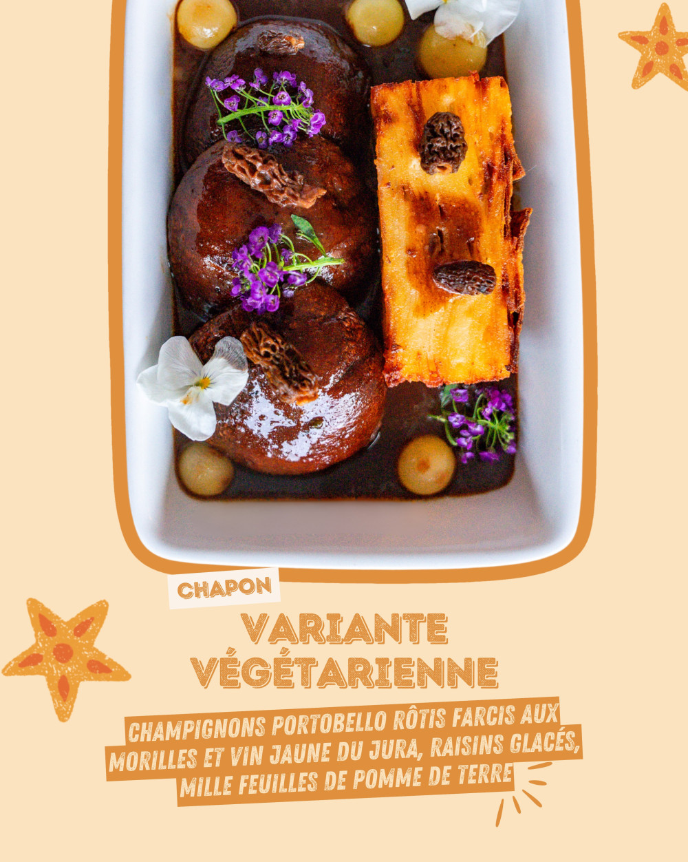 Champignons Portobello rôtis farcis aux morilles et vin jaune du Jura, raisins glacés, mille feuilles de pomme de terre